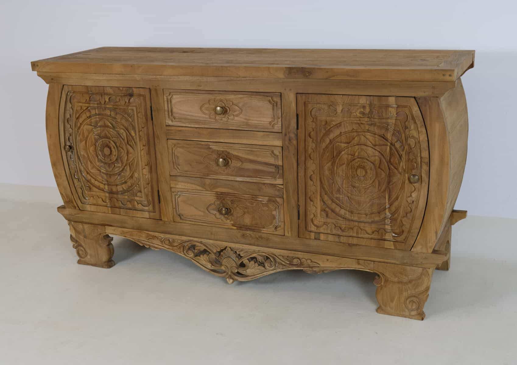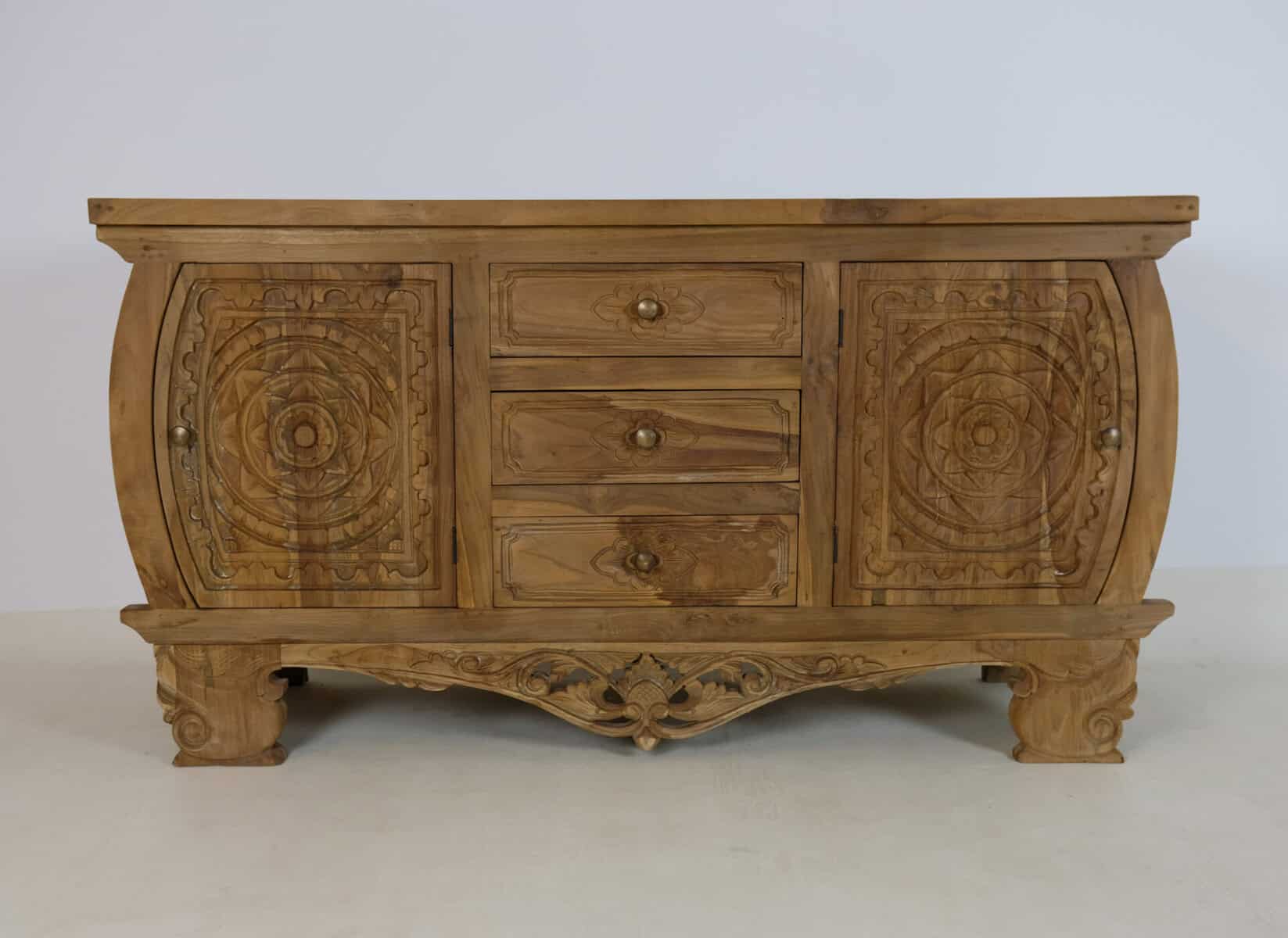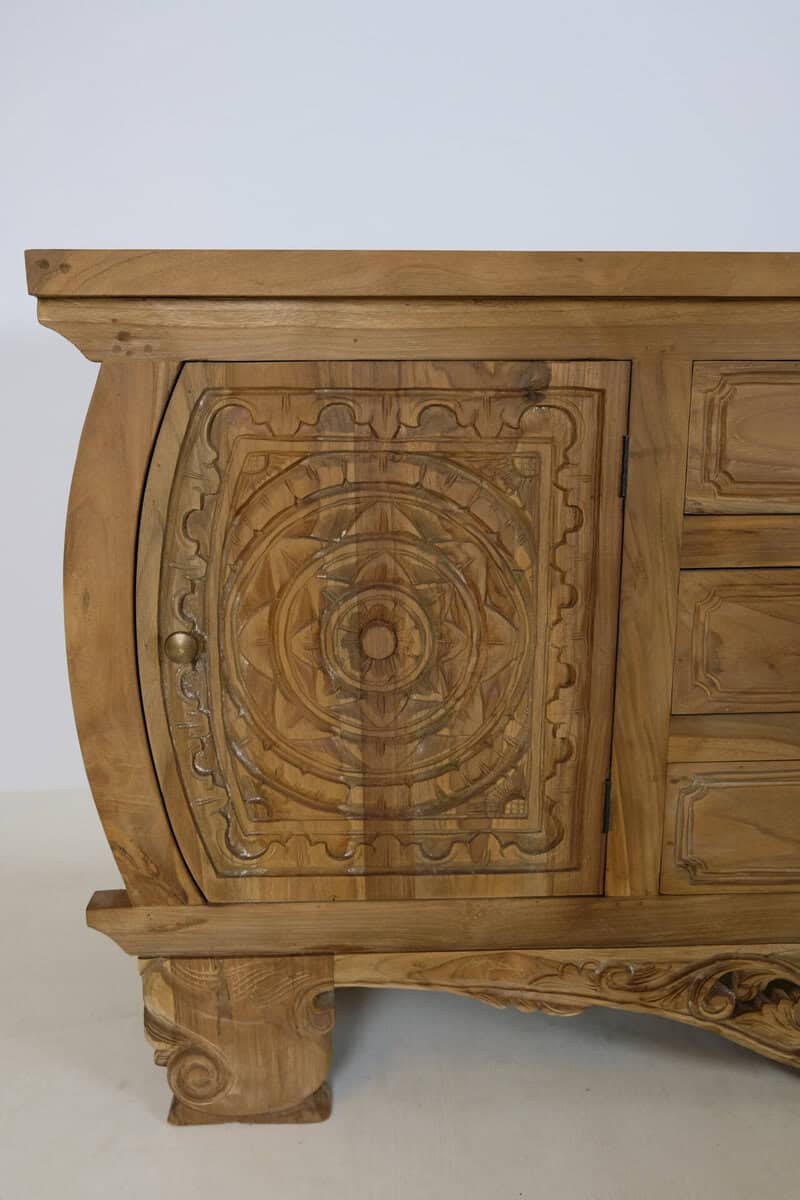 Uniek productDit dressoir straalt charme uit met zijn prachtige houtsnijwerk in bloemmotief.