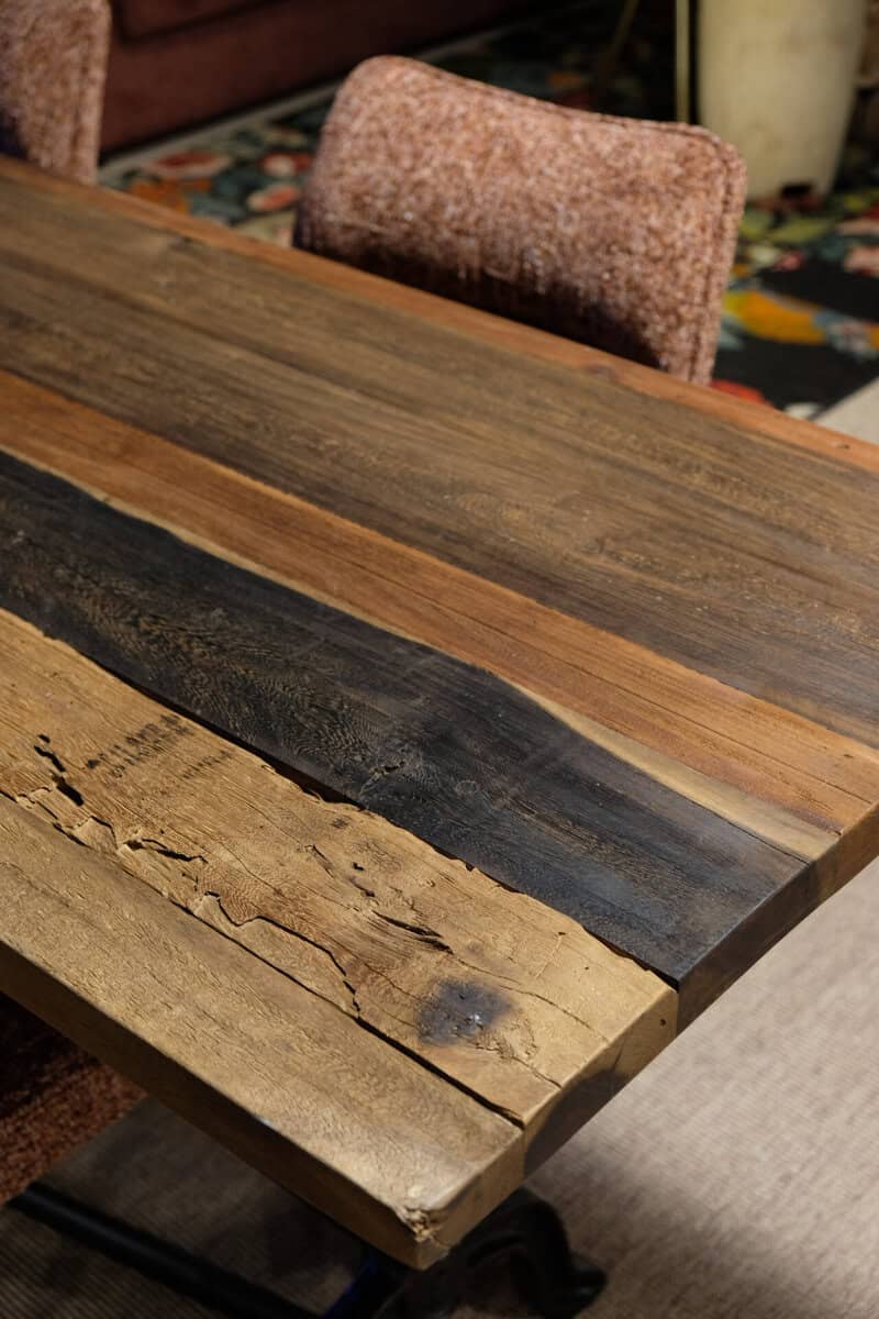 Het tafelblad is uitgevoerd in mixwood, een combinatie van verschillende houtsoorten en tinten die samen zorgen voor een levendig en uniek geheel. Geen enkel blad is hetzelfde, wat elke tafel een eigen karakter geeft.