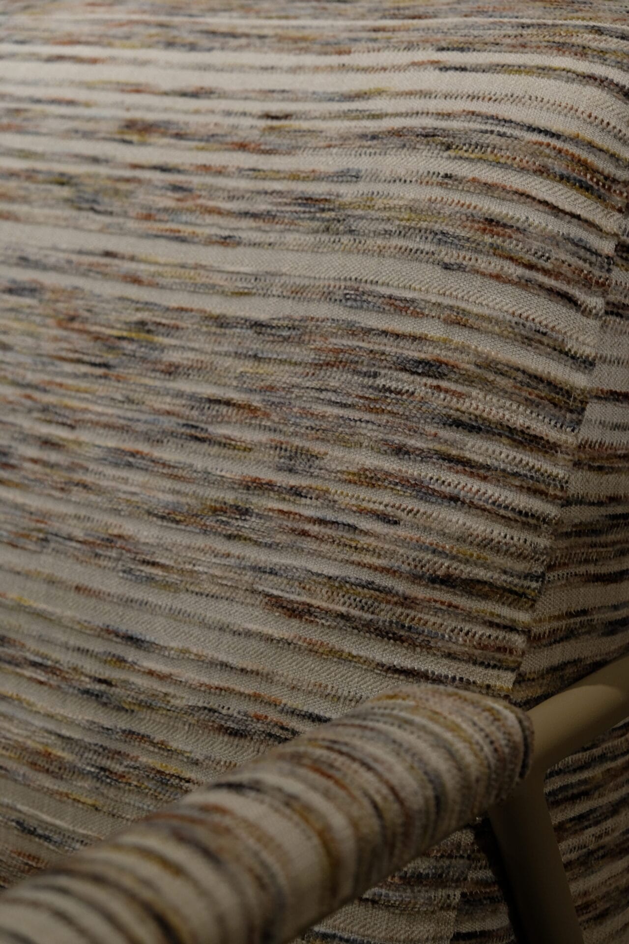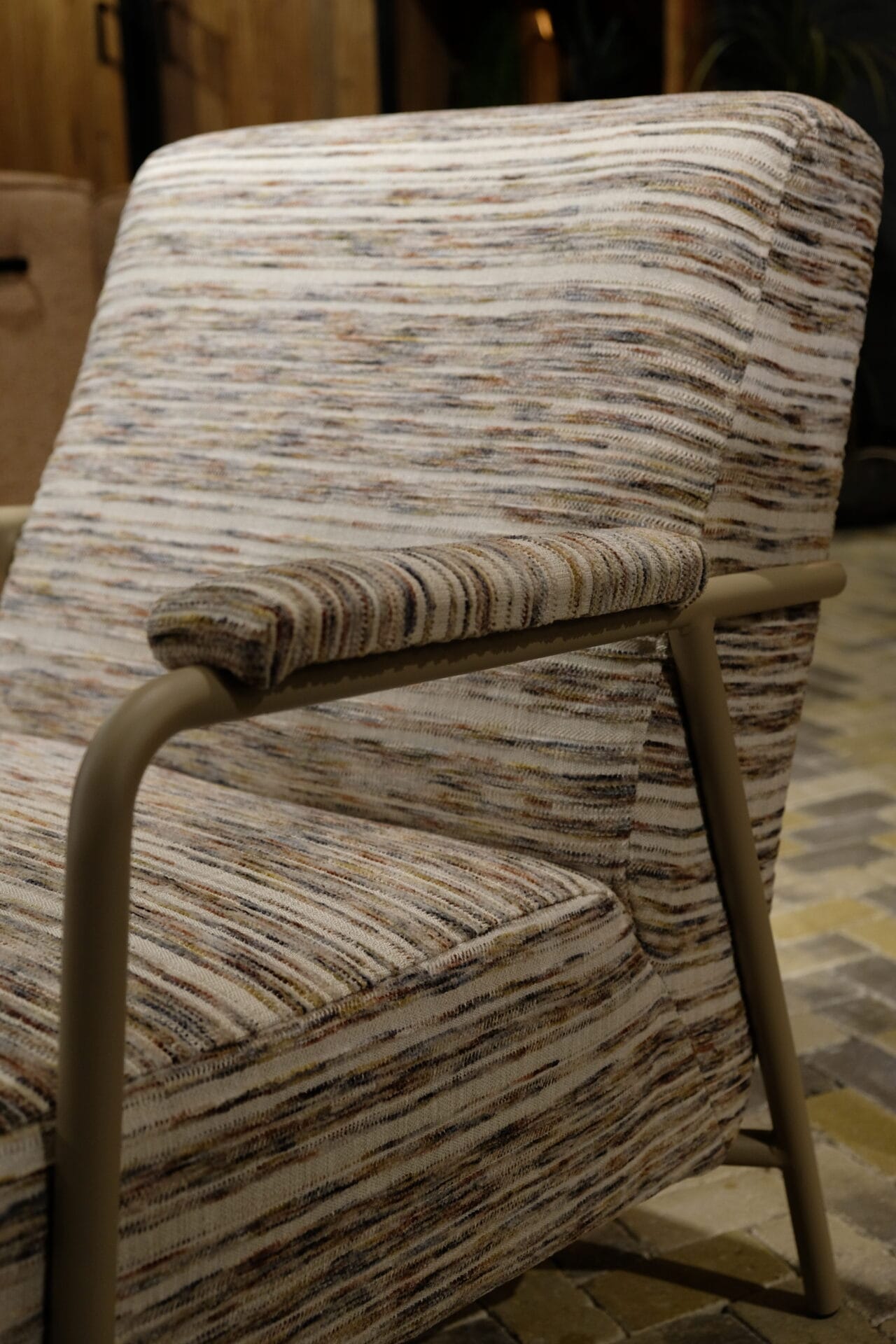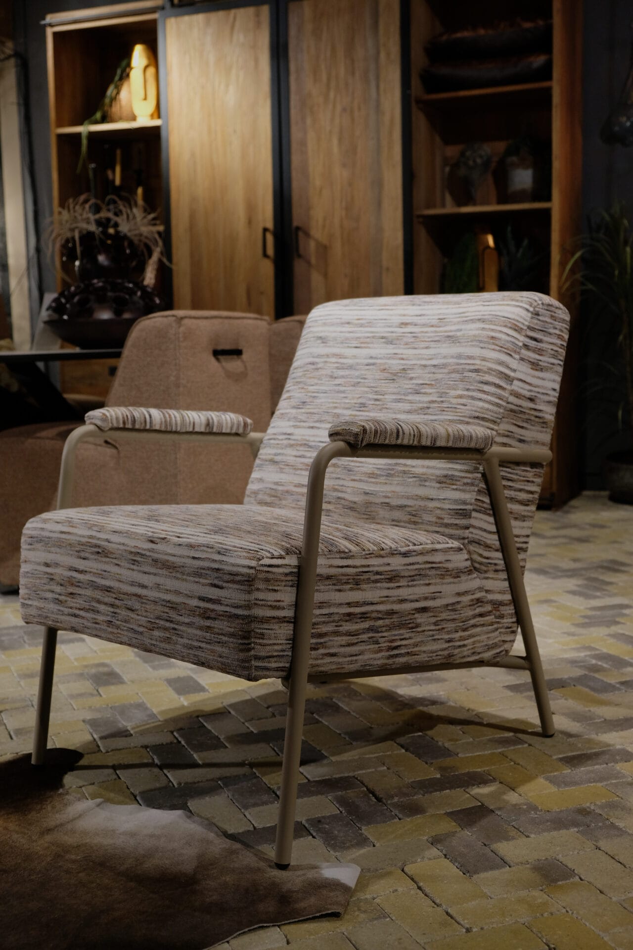 Deze stijlvolle fauteuil combineert comfort met een eigentijds design. De zachte, gemêleerde stoffering en slanke metalen armleuningen geven de stoel een warme maar moderne uitstraling. Perfect om in weg te zakken na een lange dag, en een echte blikvanger in ieder interieur.