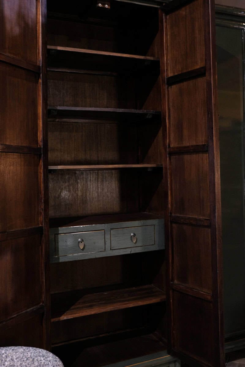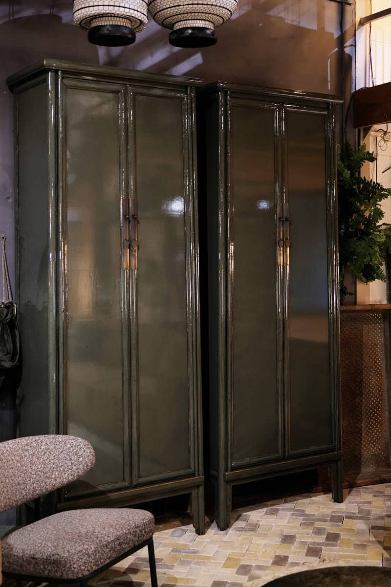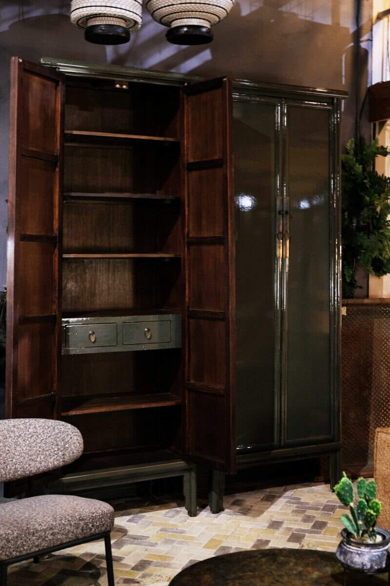 Deze prachtige kast straalt klasse en authenticiteit uit. Met zijn diepe groene kleur, subtiele glans en elegante hoge vorm is dit meubelstuk niet alleen praktisch, maar ook een echte blikvanger in je interieur.