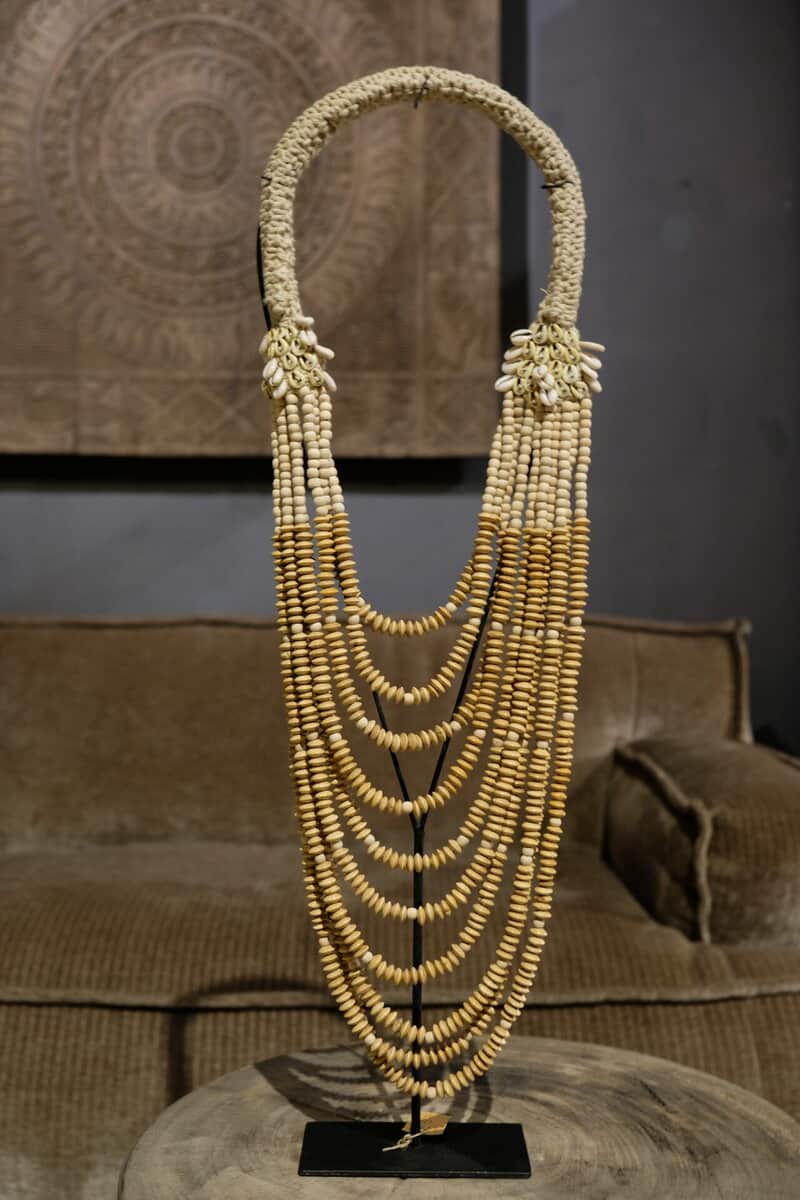 Uniek productGeïnspireerd op traditionele stammenjuwelen, met zorg handgemaakt van natuurlijke materialen en schelpen.
