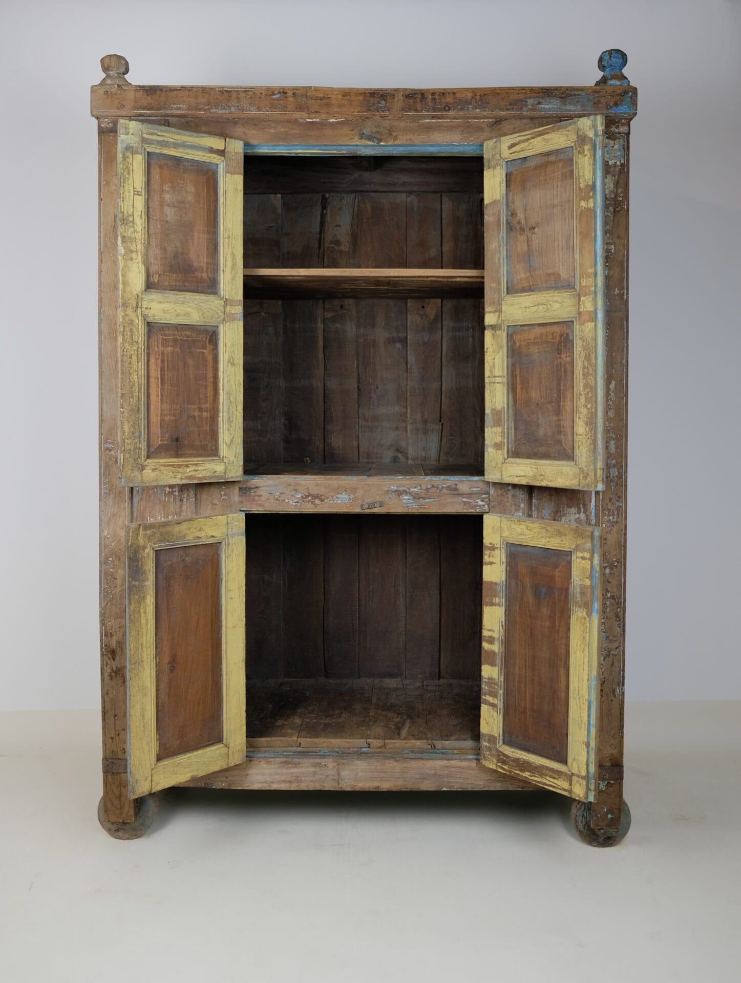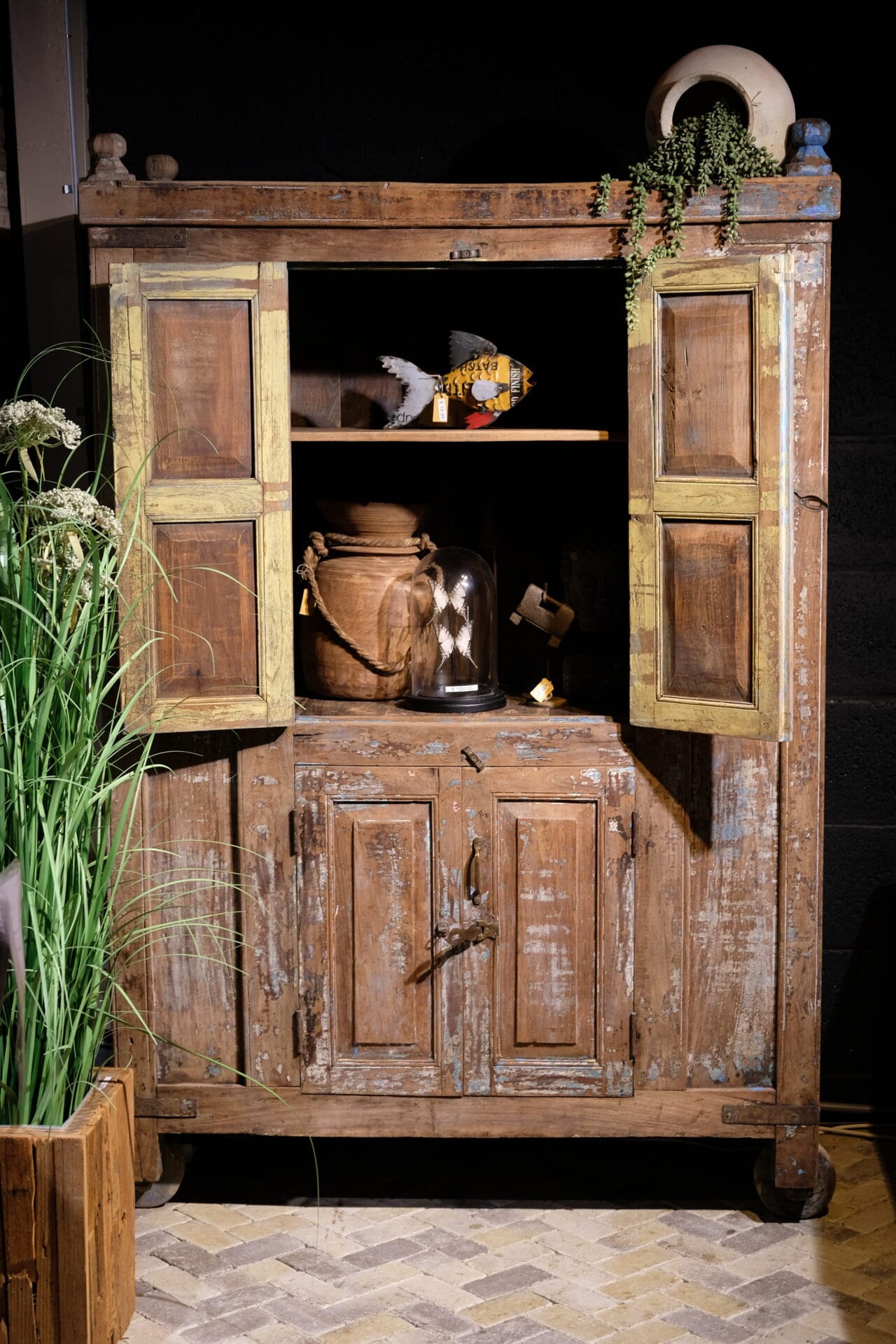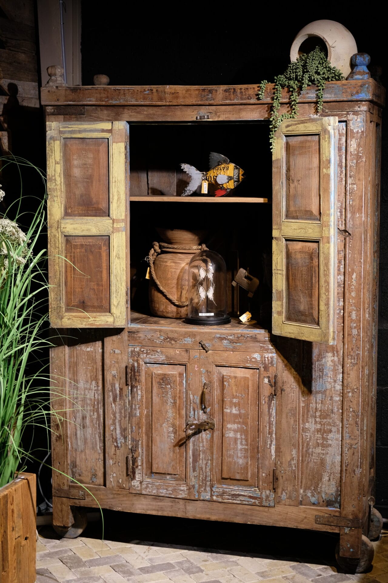 Met zijn verweerde hout en authentieke details brengt deze unieke vitrinekast direct warmte en charme in elk interieur. Perfect voor het stijlvol opbergen en tentoonstellen van je mooiste vondsten.