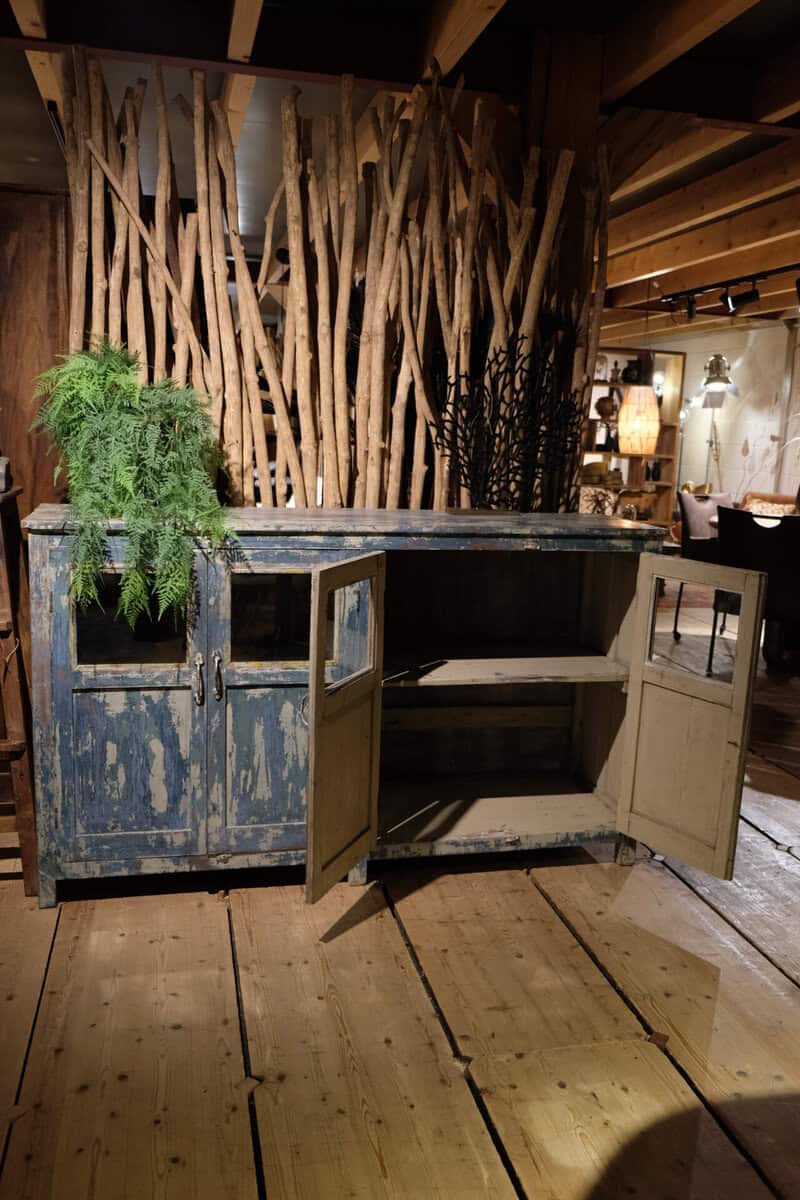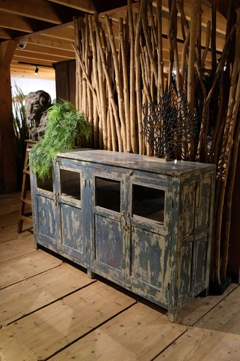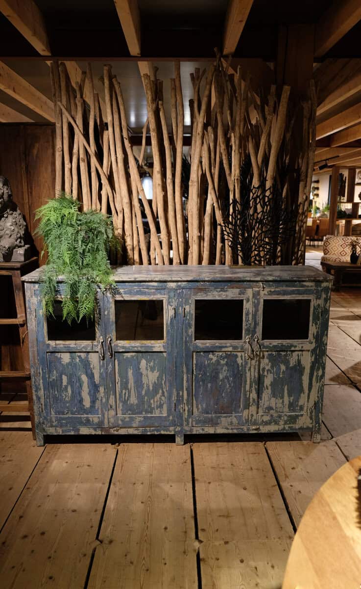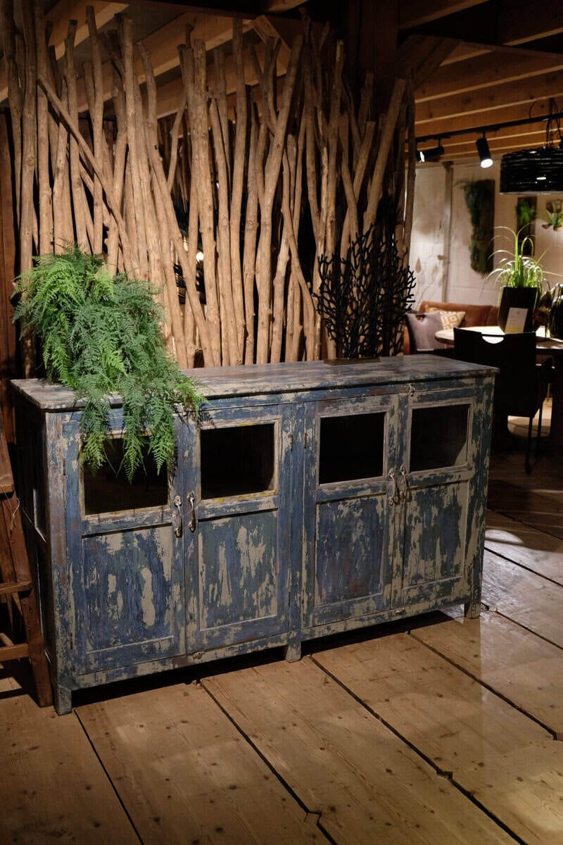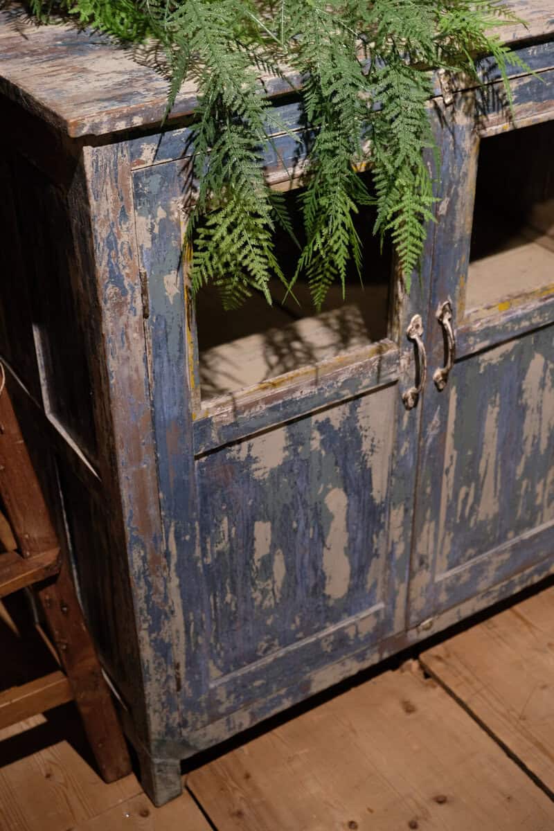 De subtiele blauw-grijze tinten versterken het robuuste karakter en zorgen tegelijkertijd voor een rustige, sfeervolle basis in je interieur. De kast is voorzien van meerdere deuren met glazen panelen, wat een speels en open effect creëert. Hierdoor is het meubel ideaal om je mooiste accessoires, servies of decoratie stijlvol te presenteren.