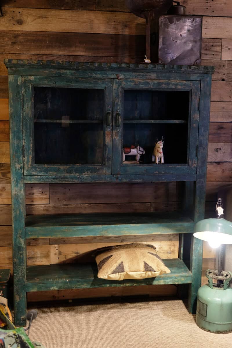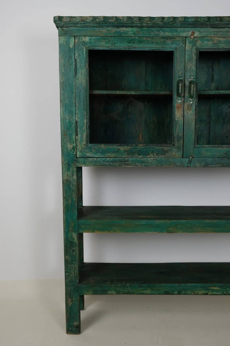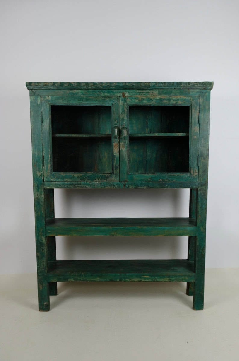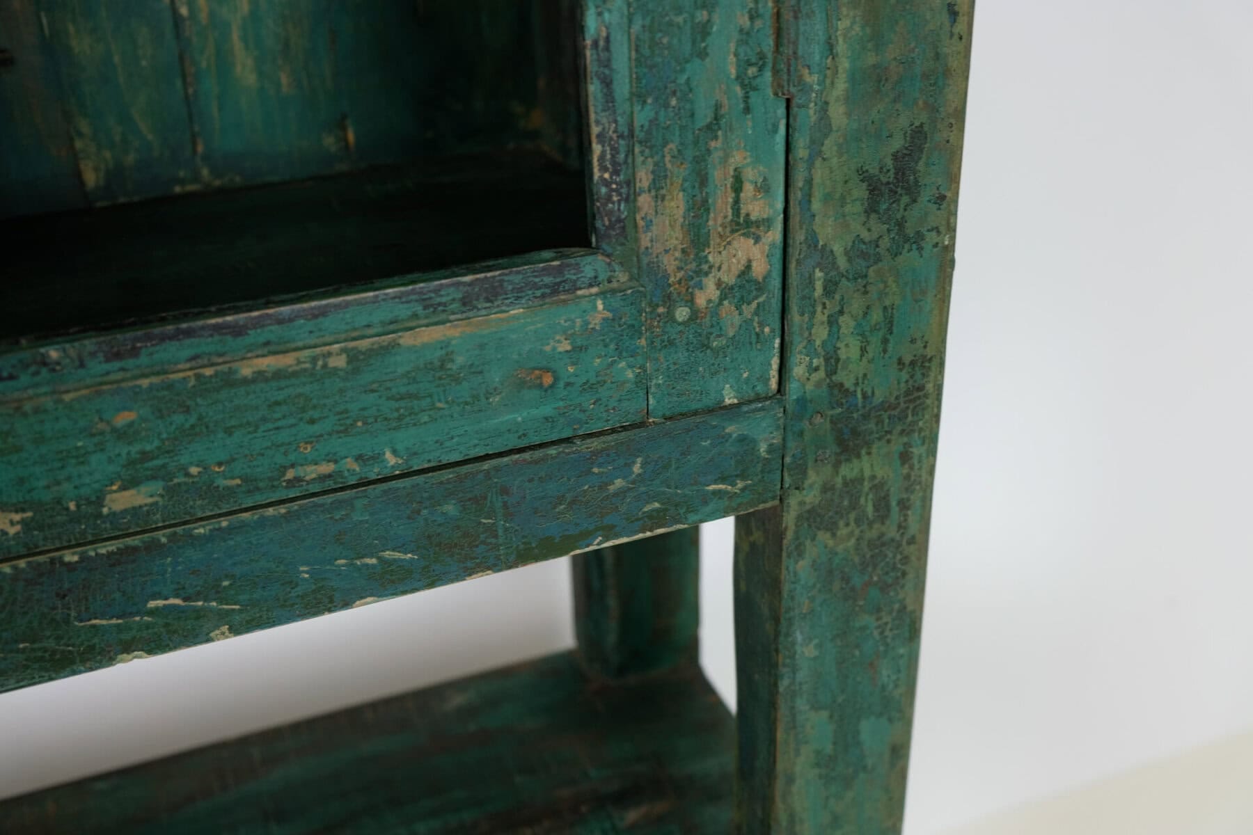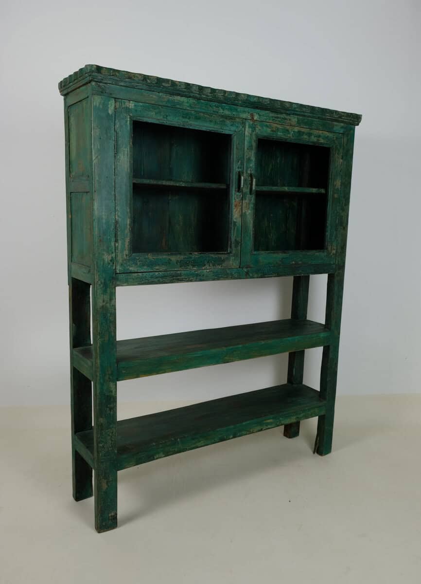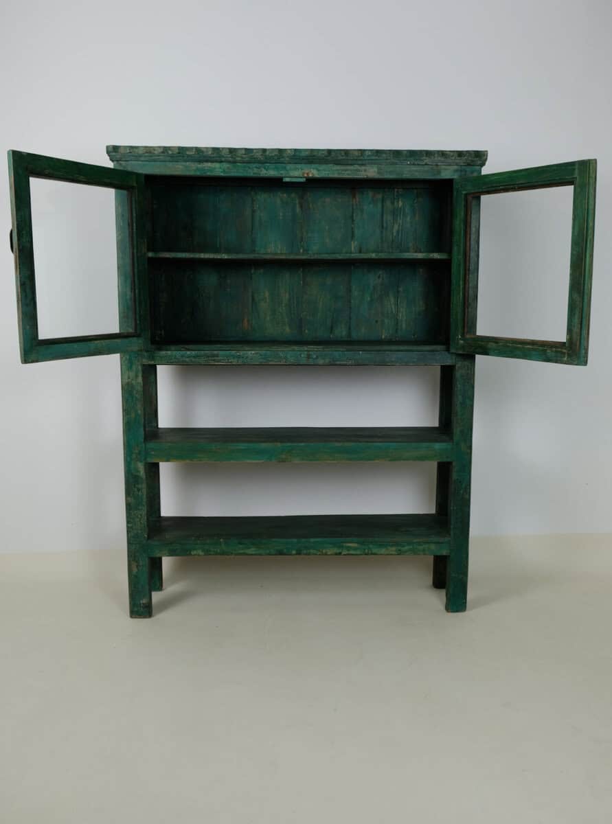 Uniek productBreng karakter en warmte in je interieur met dit unieke houten kastmeubel. Het verweerde turquoise hout en de robuuste uitstraling geven direct een authentieke vintage look. Perfect om je mooiste accessoires of boeken in te presenteren, maar ook als echte eyecatcher in de woonkamer of hal.
