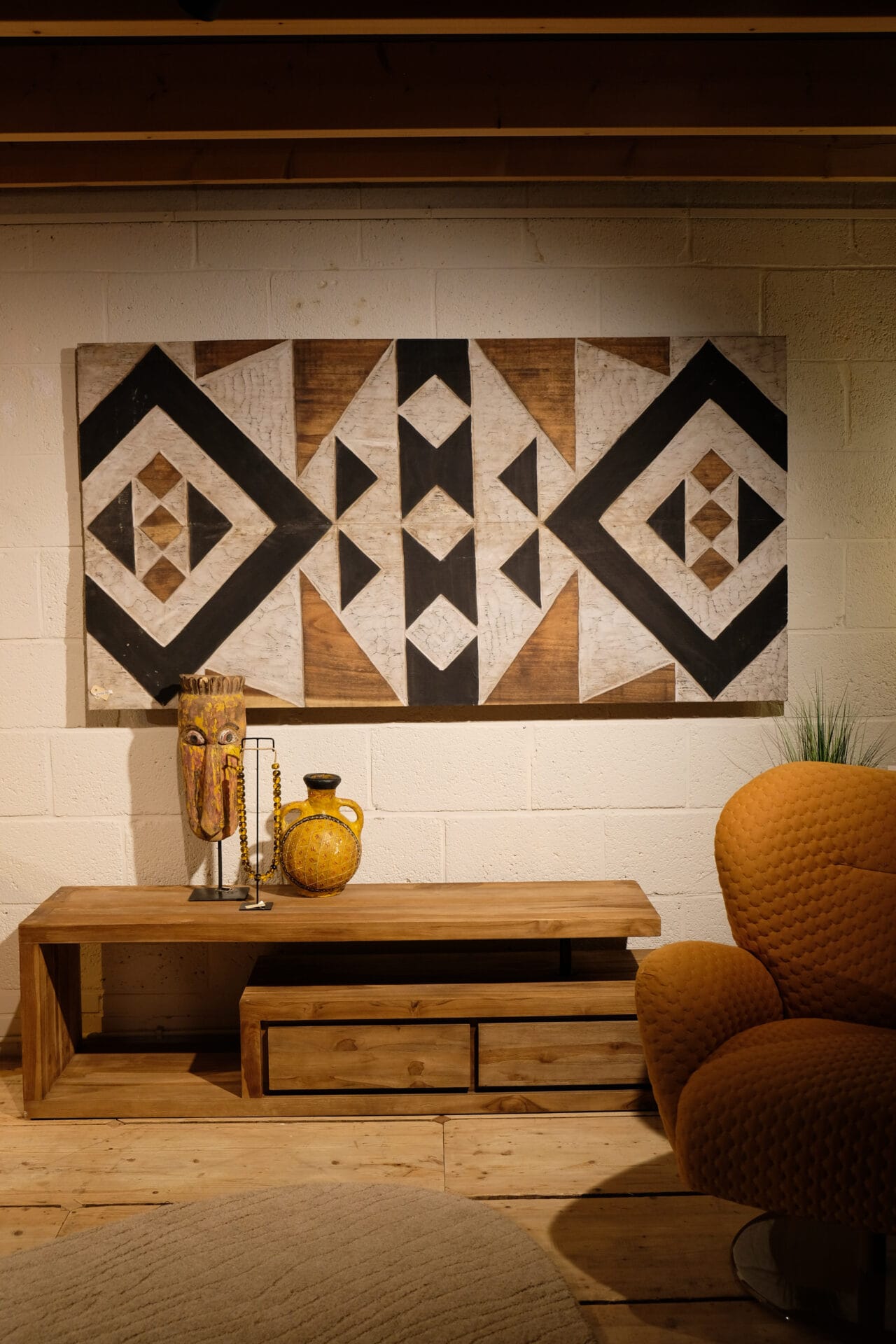 Het Nomad Geo wandpaneel uit de Livik Unique Collection is een echte blikvanger die direct sfeer en karakter toevoegt aan je interieur. Het handgemaakte ontwerp kenmerkt zich door een krachtig geometrisch patroon, geïnspireerd op traditionele motieven met een moderne twist. De combinatie van warme houttinten, zwart en wit zorgt voor een stoere, maar tegelijkertijd stijlvolle uitstraling.