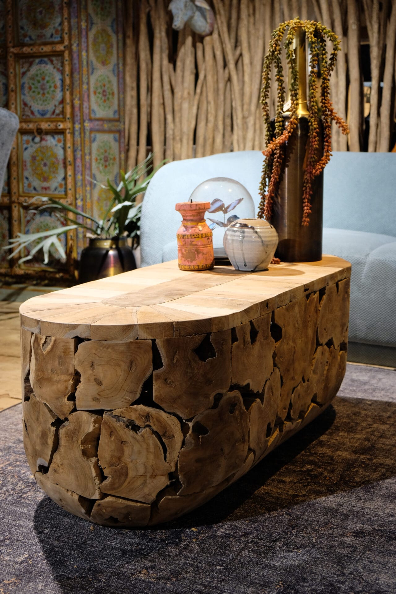 Deze unieke salontafel is een echte blikvanger in ieder interieur. De tafel is vervaardigd uit massief teakhout en opgebouwd uit zorgvuldig samengestelde houtstukken, wat zorgt voor een robuuste en natuurlijke uitstraling.