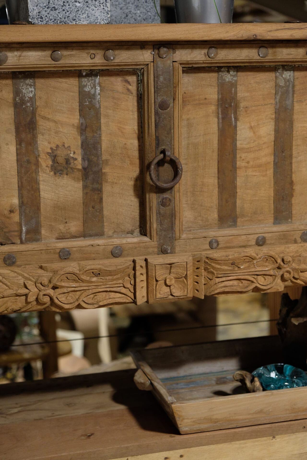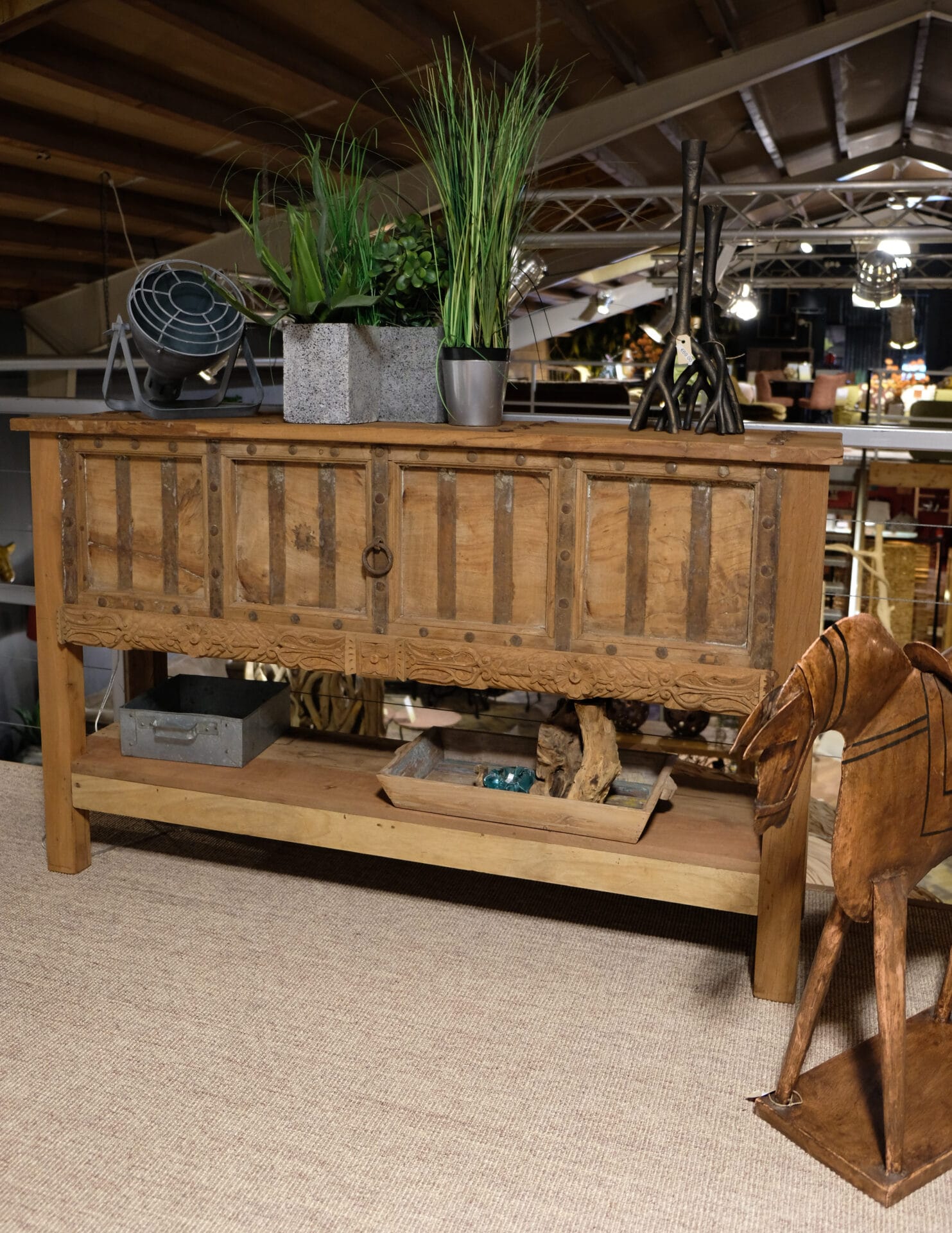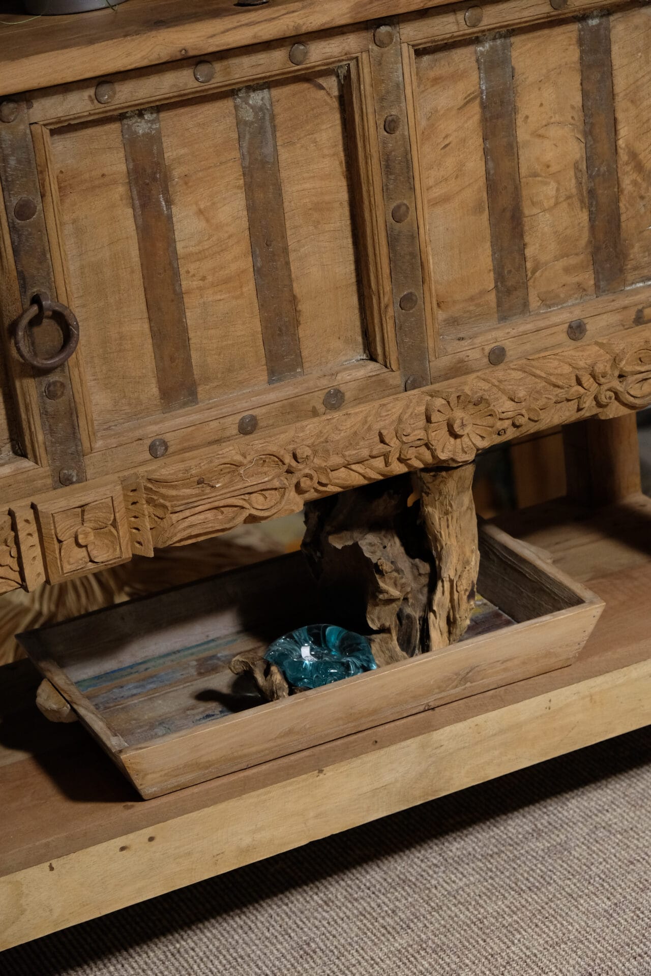 De handgesneden sierlijst aan de onderzijde benadrukt het ambachtelijke vakmanschap en geeft extra charme. De open onderplank biedt daarnaast plaats voor manden, accessoires of decoratieve items. Dankzij de combinatie van natuurlijke materialen en een tijdloos ontwerp past deze side table perfect binnen een landelijk, rustiek, industrieel of modern interieur. Een functioneel statement piece met een warme, krachtige uitstraling.