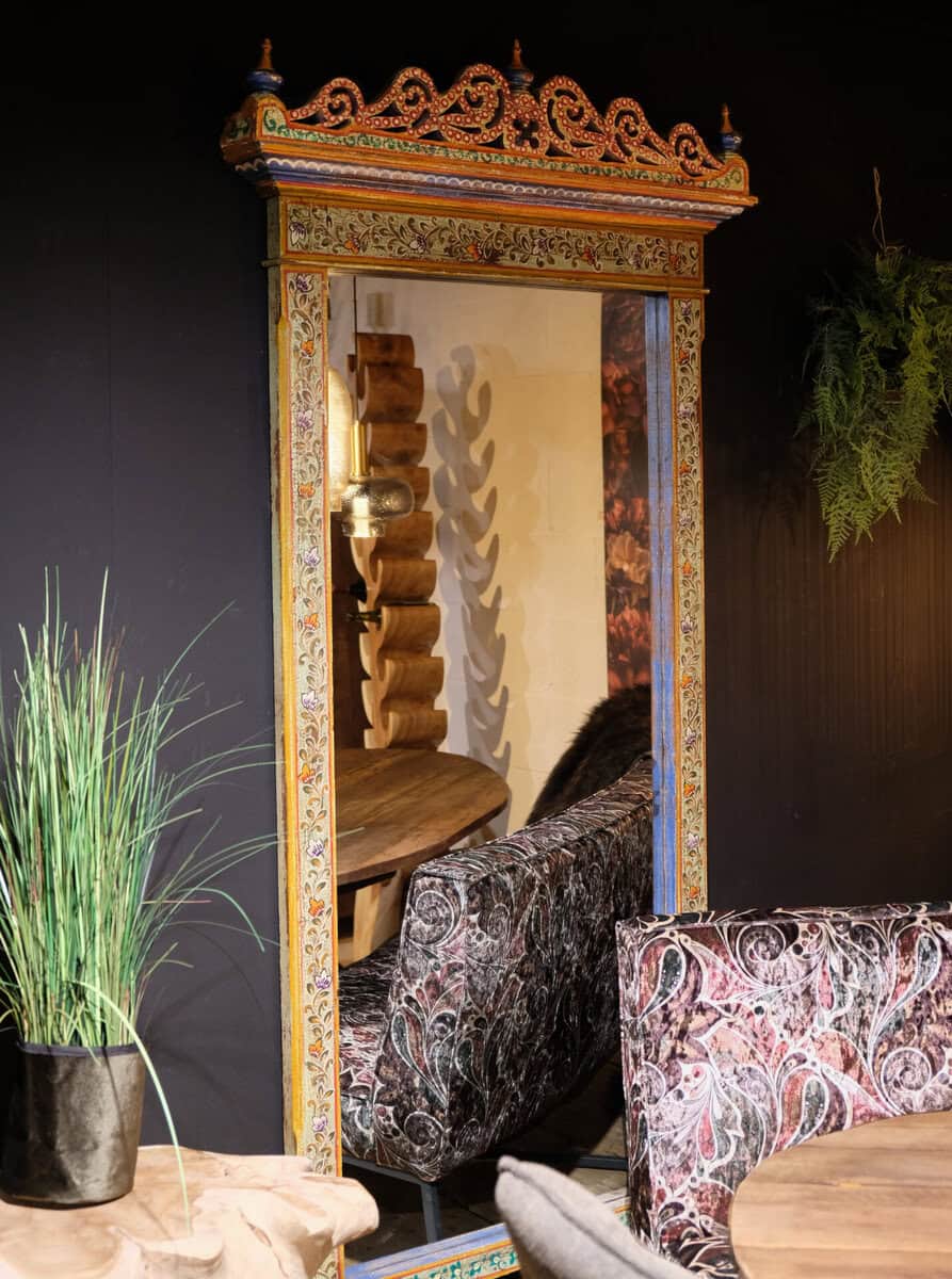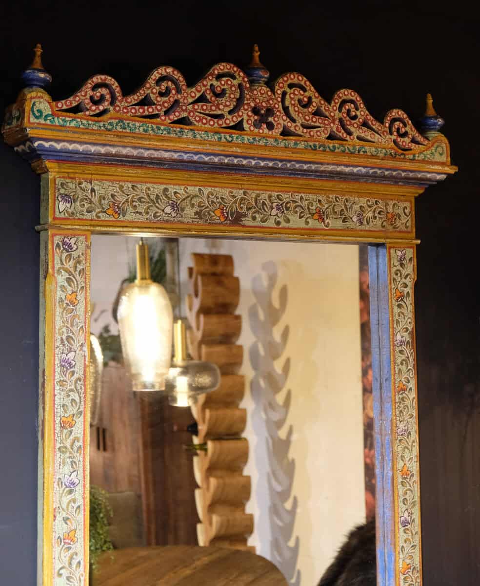 Uniek productSpiegel Zafira is een echte blikvanger met haar handbeschilderde details en warme kleuren.