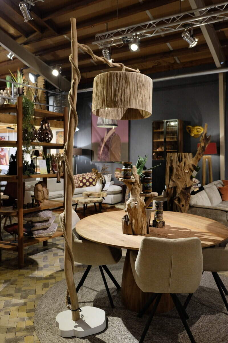 Deze unieke staande lamp is een echte blikvanger in elk interieur. Het speelse ontwerp met een organisch gevormde houten stam en grof gedraaide touwdetails geeft de lamp een ambachtelijke en natuurlijke uitstraling.