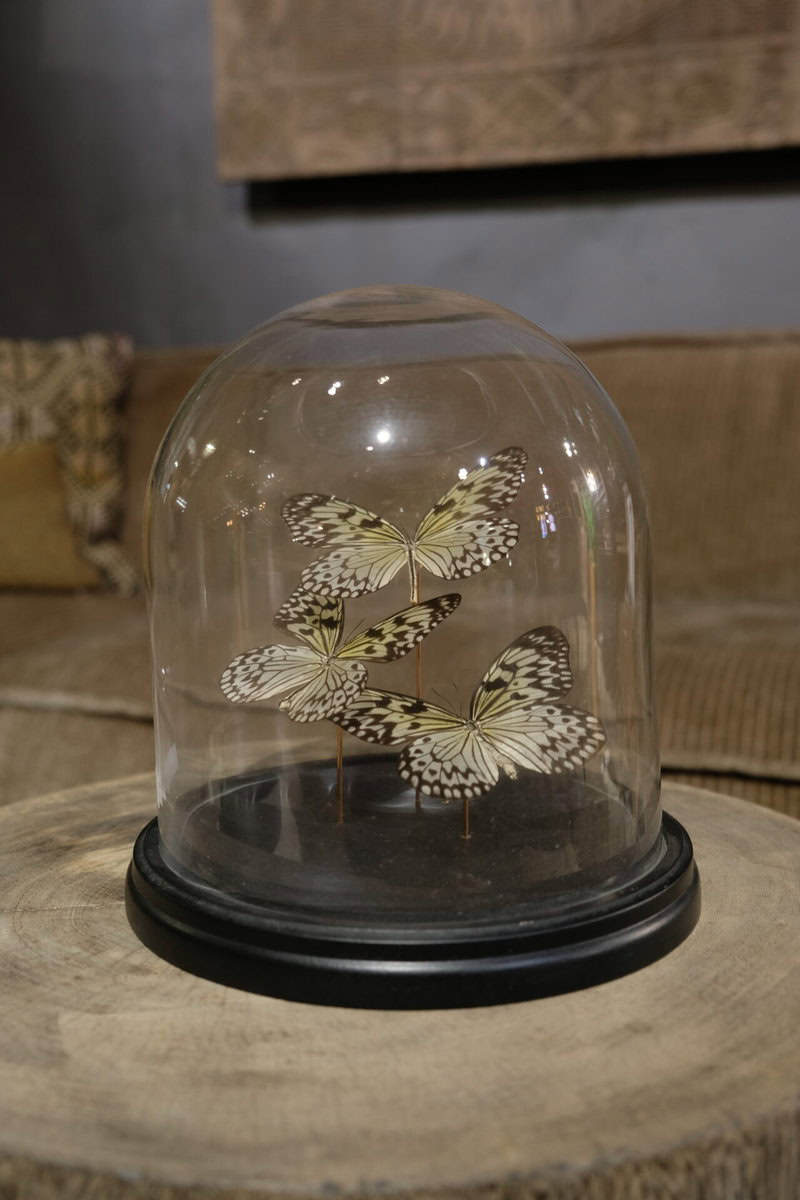 Uniek productDeze elegante glazen stolp met zorgvuldig geprepareerde vlinders brengt de schoonheid van de natuur subtiel naar binnen. Een verfijnd en poëtisch object dat rust, lichtheid en verwondering uitstraalt. Perfect als decoratief pronkstuk op een tafel, kast of wandplank.
